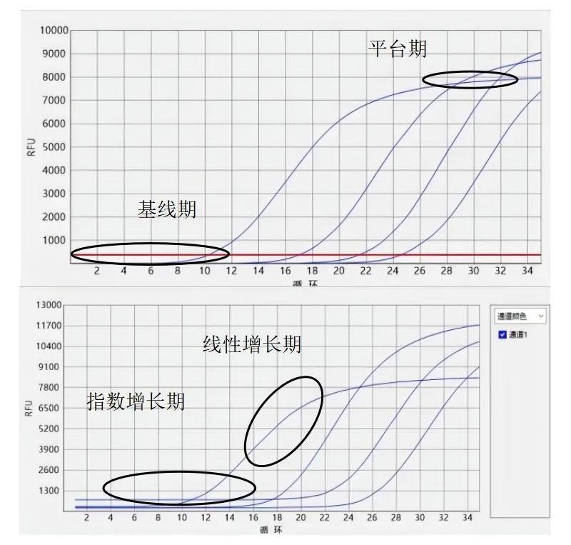 閾值:我們?cè)诓僮鬈浖r(shí)上下拉動(dòng)的橫線,是決定Ct值的因素之一。閾值是熒光信號(hào)相對(duì)于基線有顯著增強(qiáng)的點(diǎn),大多數(shù)儀器會(huì)根據(jù)基線平均信號(hào),自動(dòng)計(jì)算熒光信號(hào)的閾值水平,并設(shè)置一個(gè)比平均值高10倍的閾值。也就是說(shuō),當(dāng)基線被正確的設(shè)置了,閾值也能手動(dòng)調(diào)整成正確值。典型的擴(kuò)增曲線可以分成四個(gè)時(shí)期:基線期,指數(shù)期,線性期,平臺(tái)期。?????????