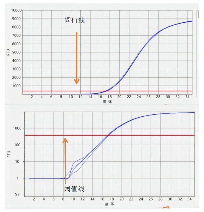 手動(dòng)設(shè)置:用戶可以手動(dòng)調(diào)整閾值線,通常將其放置在擴(kuò)增曲線的對(duì)數(shù)期,即熒光信號(hào)明顯增強(qiáng)的階段。手動(dòng)設(shè)置需要一定的經(jīng)驗(yàn)和技巧,通常在指數(shù)擴(kuò)增期的中期或后期。