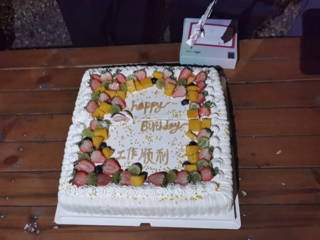 燒烤進行時,全場燈滅,領隊捧著大cake進場,原來是生日會,